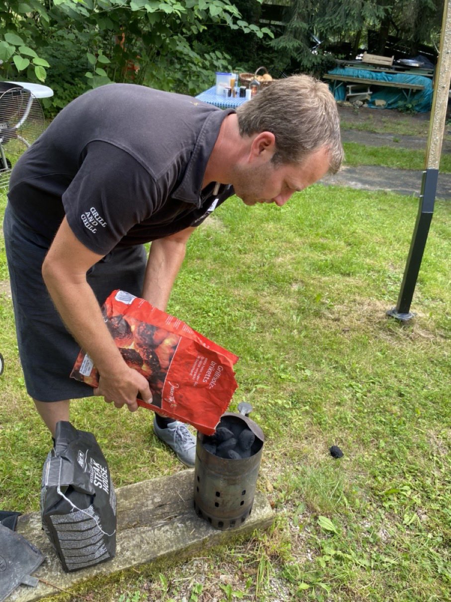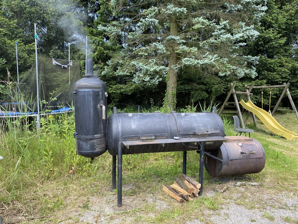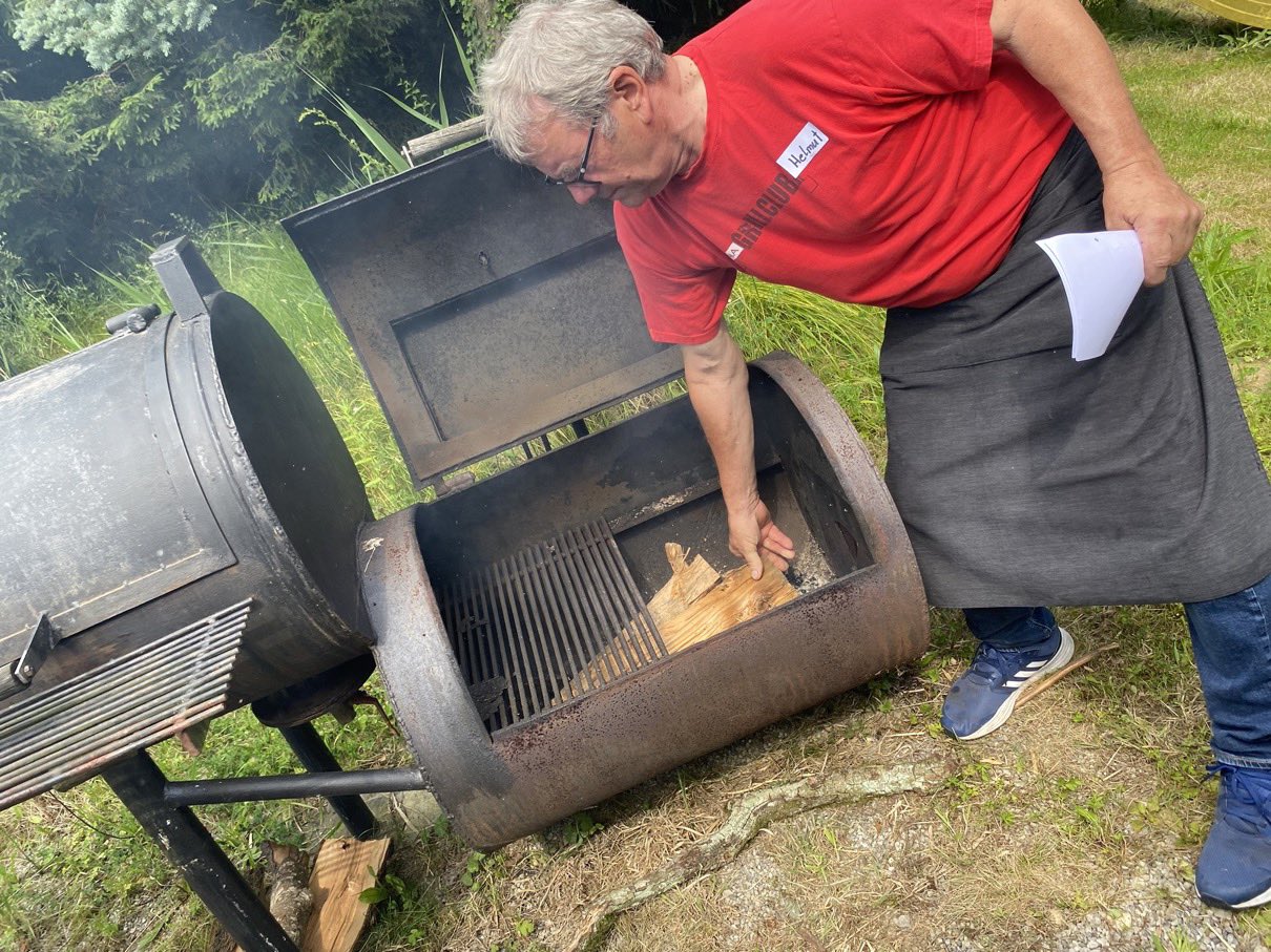 Wir waren überrascht! Mitten auf der Wiese erblickten wir unter Bäumen und in einem großen Zelt zahlreiche Grillgeräte. Chef Helmut Marchhart und Sohn Rene erklärten uns die verschiedenen Typen von Holzkohle-, Gas- und Elektrogrillern. Selbst ein großer Smoker, um dem Grillgut einen rauchigen Geschmack zu verleihen, war schon seit Stunden in Betrieb. Sie zeigten uns Anzündtechniken, unterschiedliche Grillmethoden und was es mit den verschiedenen Temperaturzonen auf sich hat. Gattin Edith und Tochter Noëlle halfen bei den Zubereitungen und waren die guten Geister im Hintergrund.