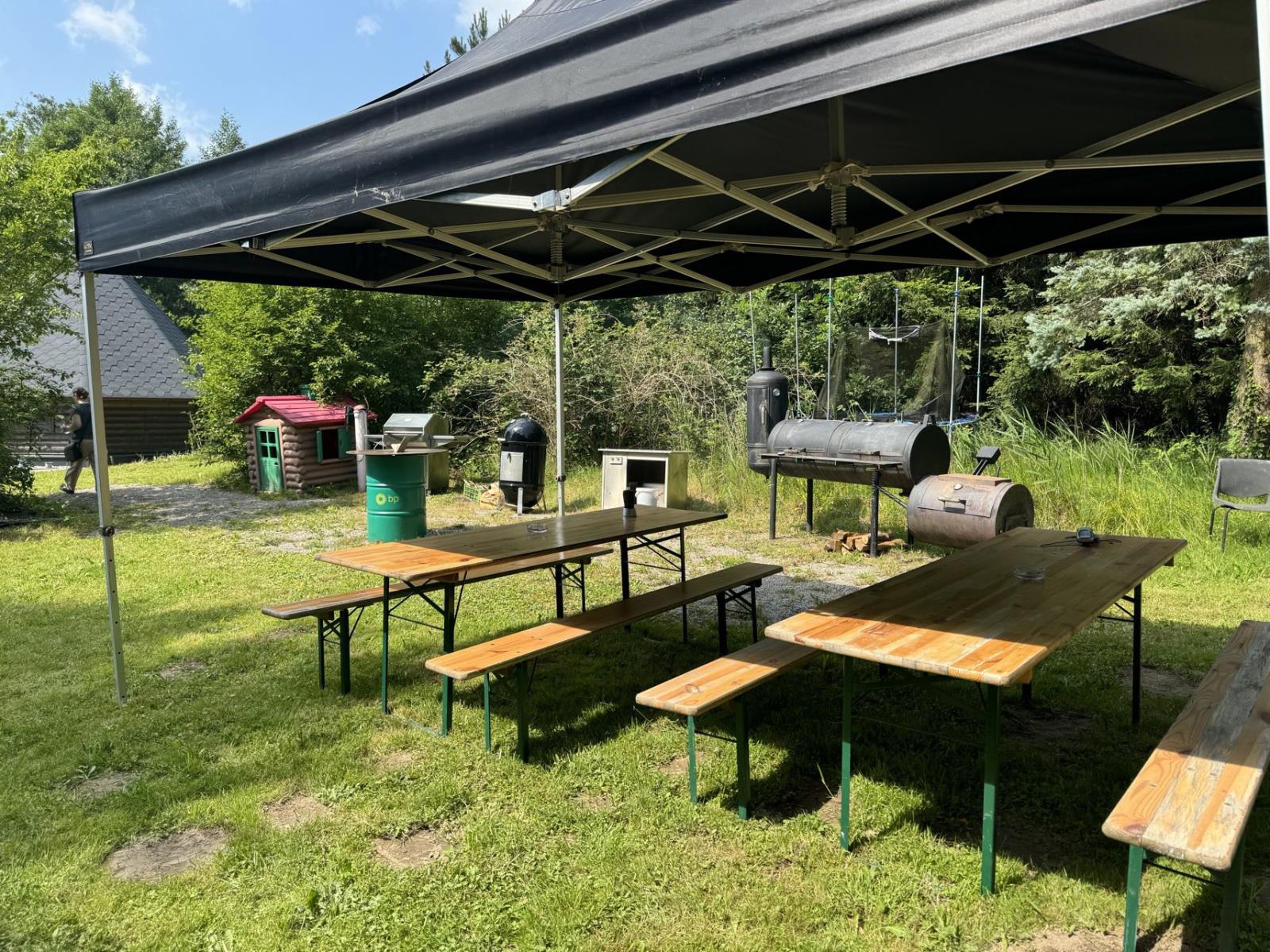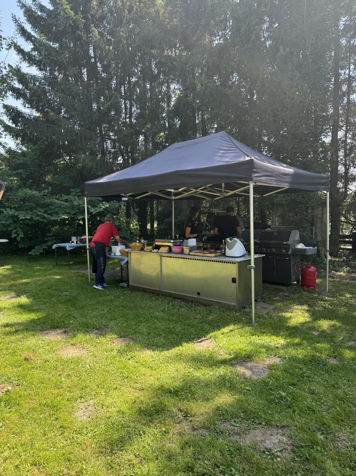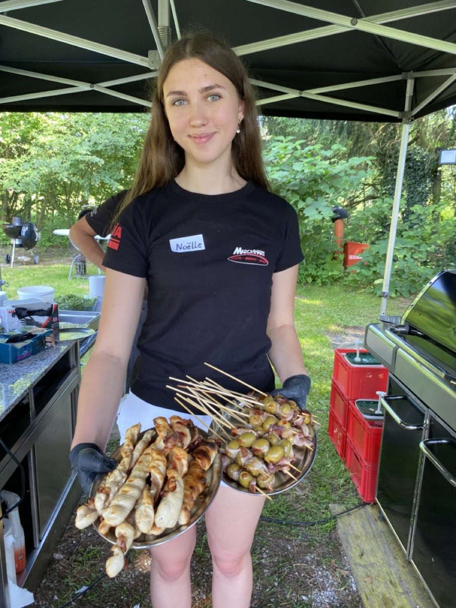 Wir waren überrascht! Mitten auf der Wiese erblickten wir unter Bäumen und in einem großen Zelt zahlreiche Grillgeräte. Chef Helmut Marchhart und Sohn Rene erklärten uns die verschiedenen Typen von Holzkohle-, Gas- und Elektrogrillern. Selbst ein großer Smoker, um dem Grillgut einen rauchigen Geschmack zu verleihen, war schon seit Stunden in Betrieb. Sie zeigten uns Anzündtechniken, unterschiedliche Grillmethoden und was es mit den verschiedenen Temperaturzonen auf sich hat. Gattin Edith und Tochter Noëlle halfen bei den Zubereitungen und waren die guten Geister im Hintergrund.