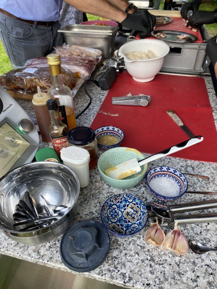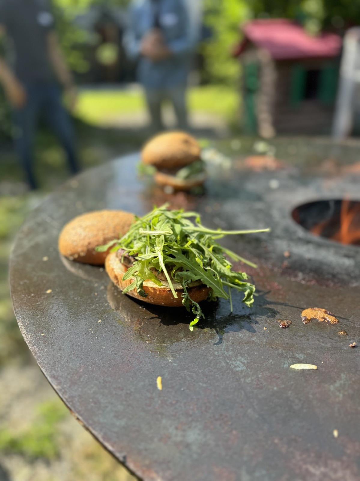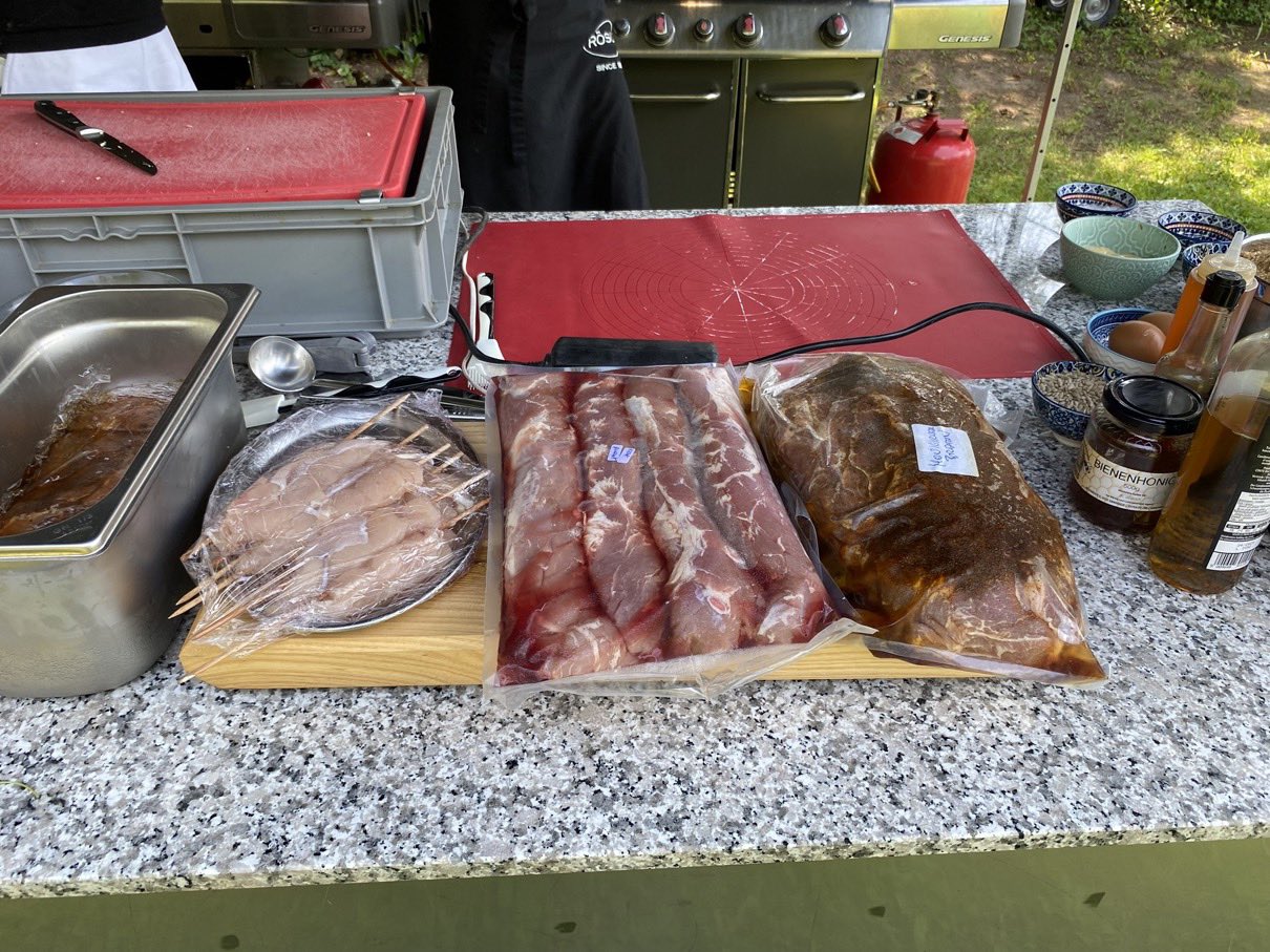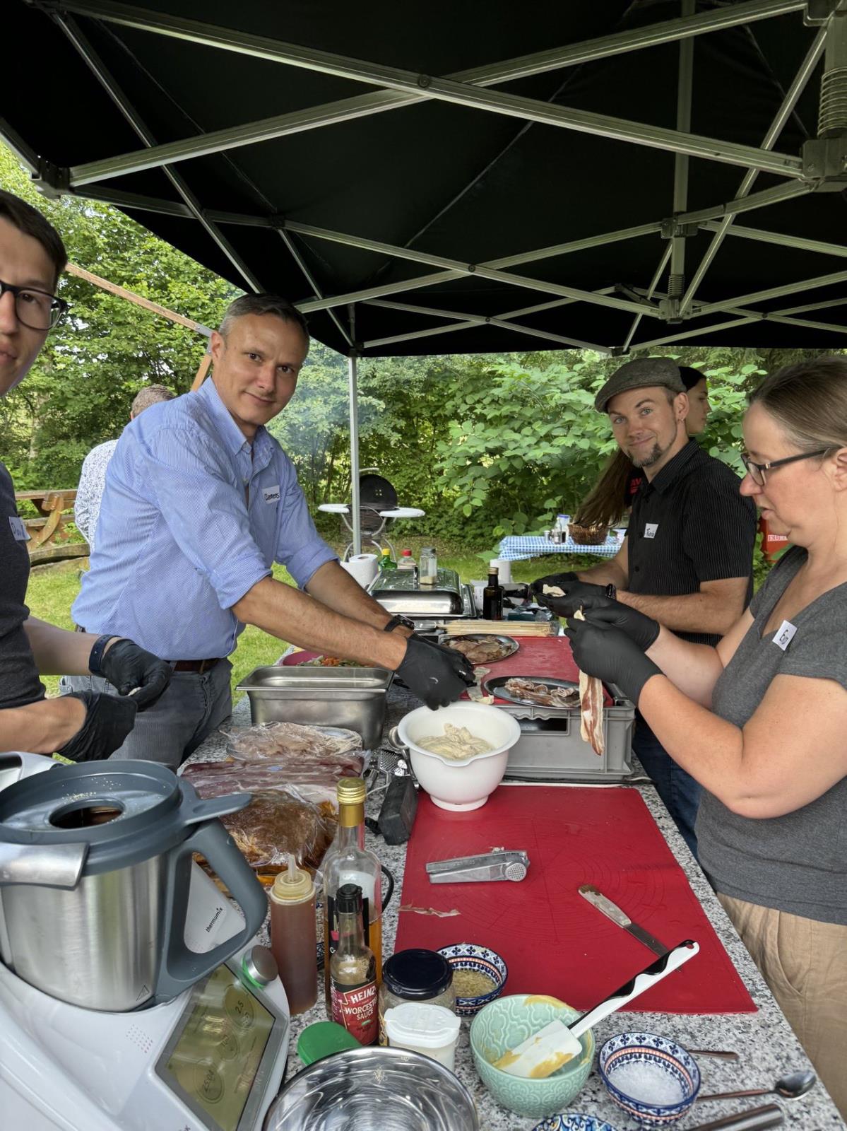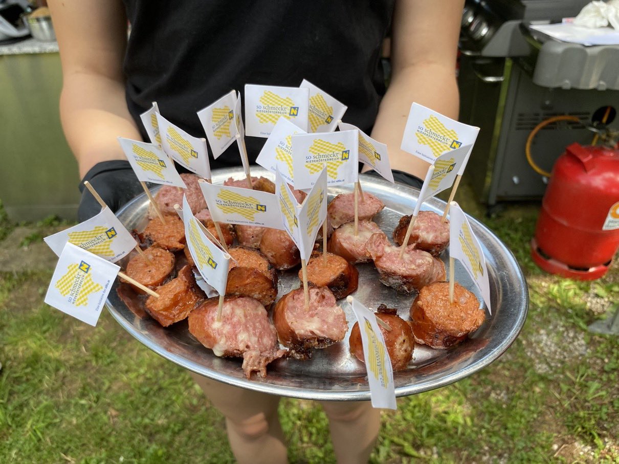 Dann ging es mit dem Zubereiten los. Speckstangerl aus einem selbstgemachten Germteig und Oliven im Speckmantel gab es zu kühlen Getränken als Entree. Die Grillprofis unterstützten und ermutigten uns zum Mitmachen. Über den Nachmittag verteilt gab es noch einen Pulled-Pork-Burger, Hühnerspießchen und ein zartes Beiried, das zuvor über zwölf Stunden Sous-vide bei 100 Grad gegart wurde und dann noch kurz am Griller brutzelte. Hinzu kamen ein Honig-Krustenbraten, der rund zwei Stunden im Griller garte, sowie ein Schweinslungenbraten in Mangalitzaspeck-Hülle. Viel Gemüse, Rösti, Maiskolben, gegrillte Käsestücke und gegrillter Rucola mit Sonnenblumenkernen und Weichkäse rundeten die verschiedenen Geschmacksrichtungen ab. Der krönende Abschluss: das Dessert. Es gab Buchteln mit Marillenmarmelade, eingelegtes Obst und Apfelsoße. Der Germteig wurde frisch hergestellt, die Apfelsoße war eine Alternative zur Vanillesoße.