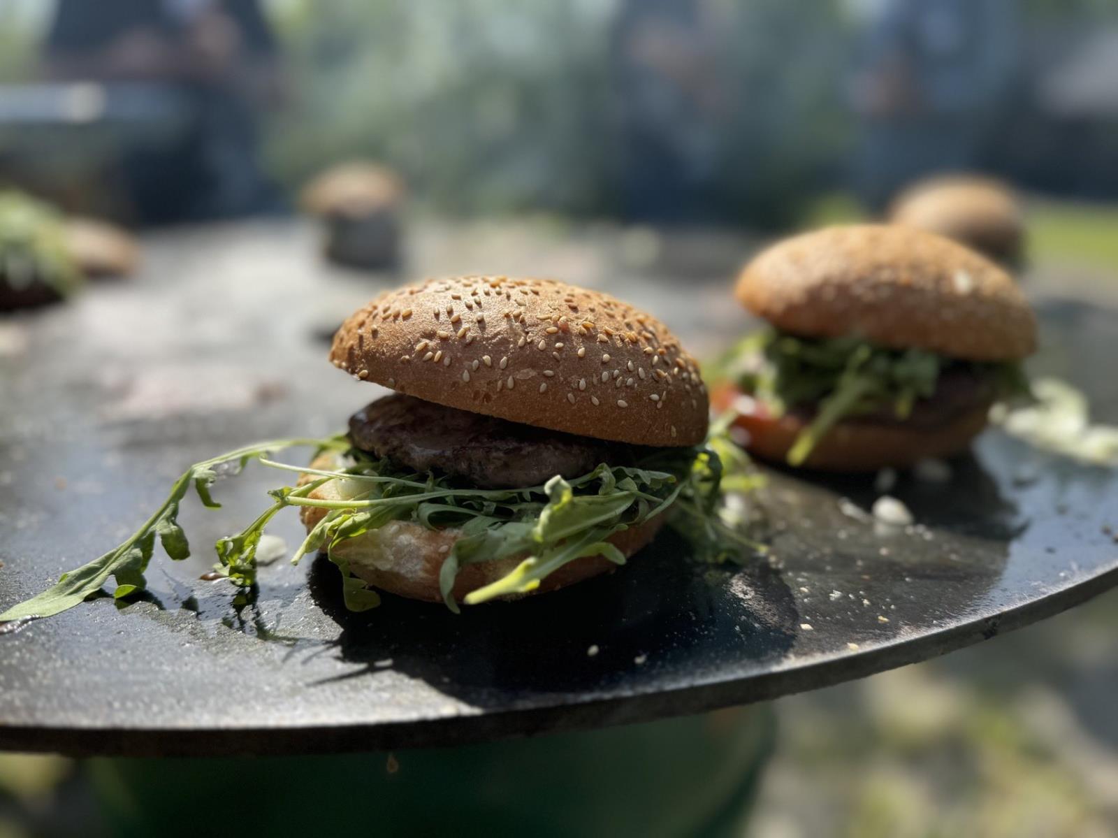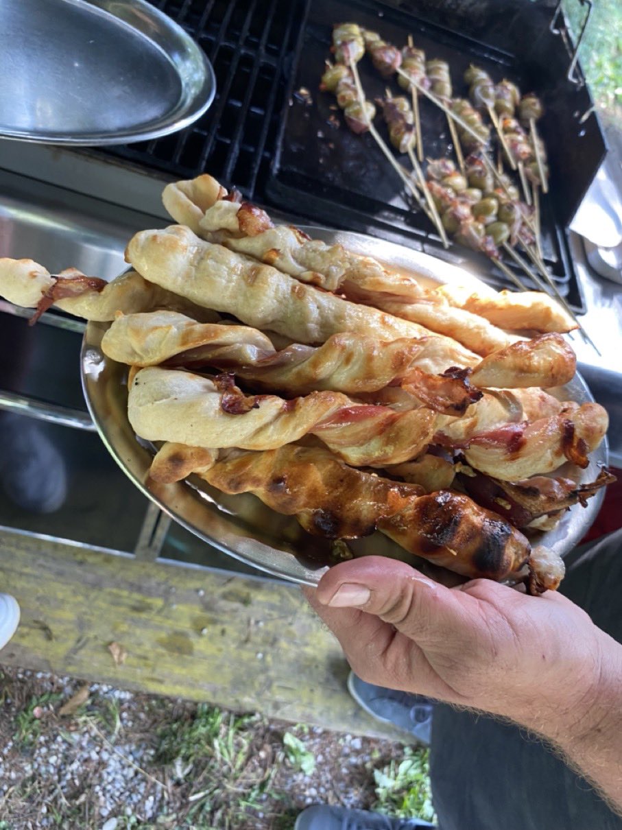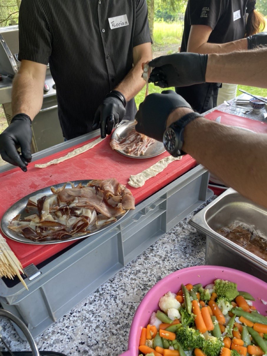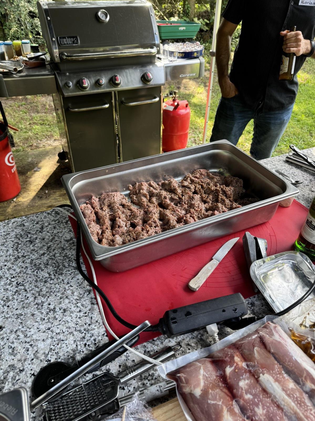 Dann ging es mit dem Zubereiten los. Speckstangerl aus einem selbstgemachten Germteig und Oliven im Speckmantel gab es zu kühlen Getränken als Entree. Die Grillprofis unterstützten und ermutigten uns zum Mitmachen. Über den Nachmittag verteilt gab es noch einen Pulled-Pork-Burger, Hühnerspießchen und ein zartes Beiried, das zuvor über zwölf Stunden Sous-vide bei 100 Grad gegart wurde und dann noch kurz am Griller brutzelte. Hinzu kamen ein Honig-Krustenbraten, der rund zwei Stunden im Griller garte, sowie ein Schweinslungenbraten in Mangalitzaspeck-Hülle. Viel Gemüse, Rösti, Maiskolben, gegrillte Käsestücke und gegrillter Rucola mit Sonnenblumenkernen und Weichkäse rundeten die verschiedenen Geschmacksrichtungen ab. Der krönende Abschluss: das Dessert. Es gab Buchteln mit Marillenmarmelade, eingelegtes Obst und Apfelsoße. Der Germteig wurde frisch hergestellt, die Apfelsoße war eine Alternative zur Vanillesoße.