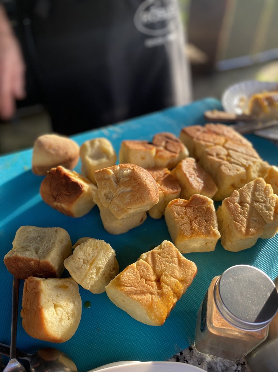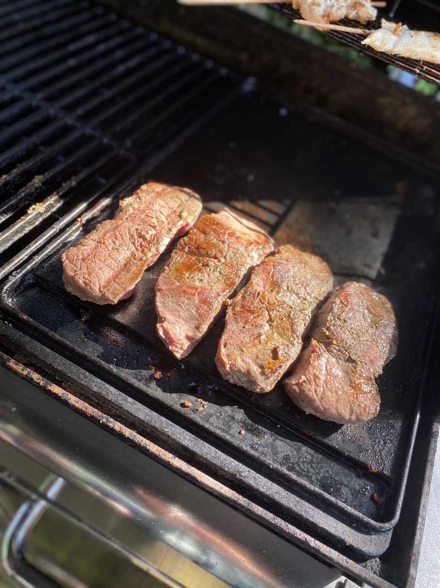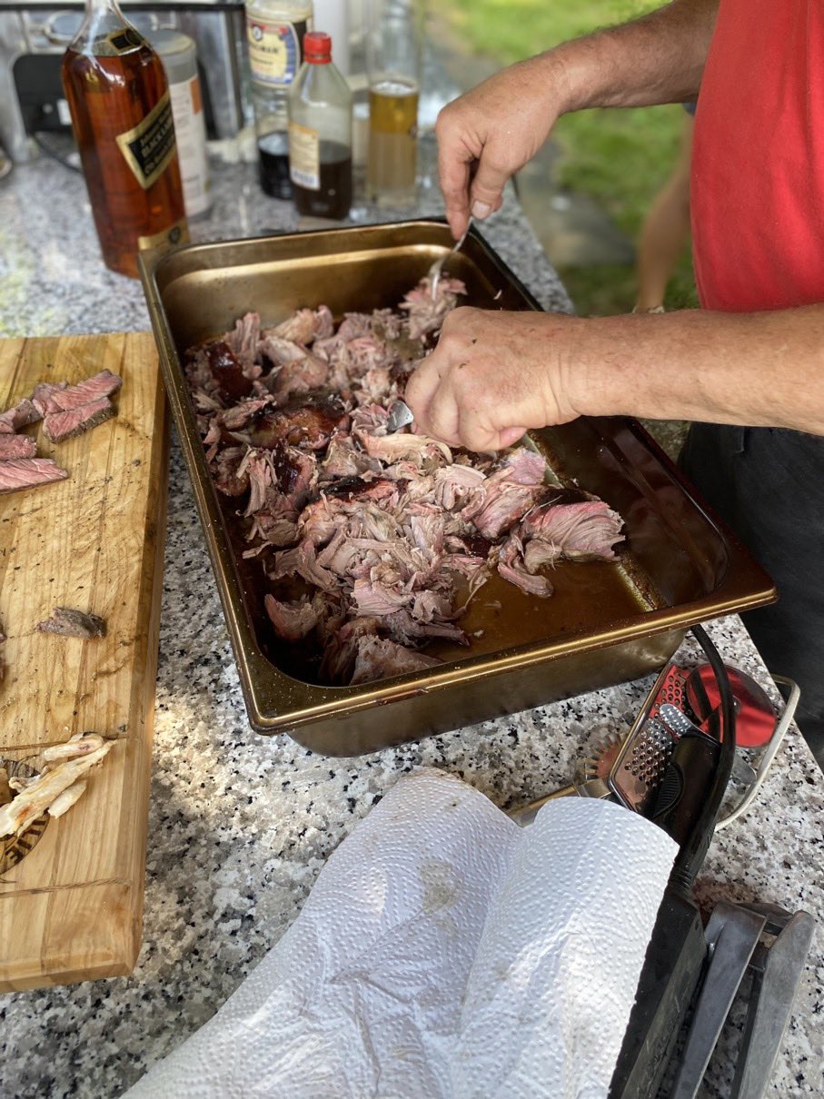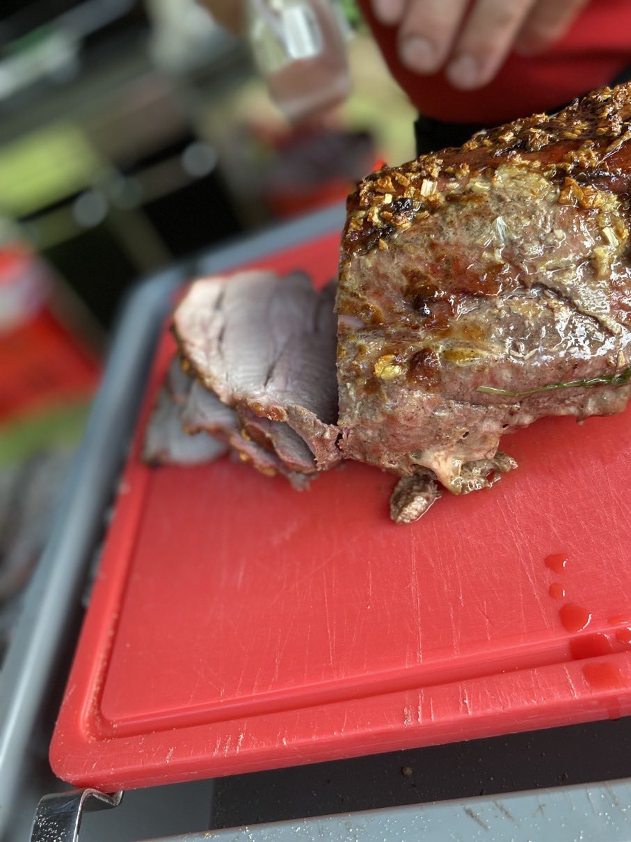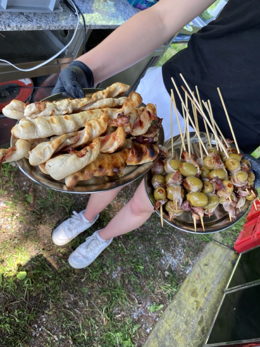 Dann ging es mit dem Zubereiten los. Speckstangerl aus einem selbstgemachten Germteig und Oliven im Speckmantel gab es zu kühlen Getränken als Entree. Die Grillprofis unterstützten und ermutigten uns zum Mitmachen. Über den Nachmittag verteilt gab es noch einen Pulled-Pork-Burger, Hühnerspießchen und ein zartes Beiried, das zuvor über zwölf Stunden Sous-vide bei 100 Grad gegart wurde und dann noch kurz am Griller brutzelte. Hinzu kamen ein Honig-Krustenbraten, der rund zwei Stunden im Griller garte, sowie ein Schweinslungenbraten in Mangalitzaspeck-Hülle. Viel Gemüse, Rösti, Maiskolben, gegrillte Käsestücke und gegrillter Rucola mit Sonnenblumenkernen und Weichkäse rundeten die verschiedenen Geschmacksrichtungen ab. Der krönende Abschluss: das Dessert. Es gab Buchteln mit Marillenmarmelade, eingelegtes Obst und Apfelsoße. Der Germteig wurde frisch hergestellt, die Apfelsoße war eine Alternative zur Vanillesoße.